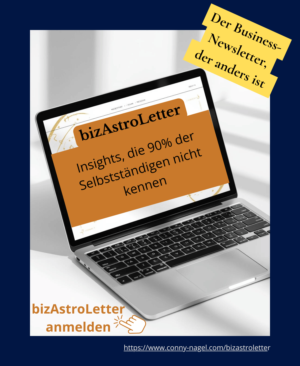 Mit dem bizAstroLetter kann ich meine Expertise als Astrologin & Unternehmerin reinbringen. Im bizAstroLetter zeige ich dir, wie du dein Geburts-Chart-Profil im Beruf und als Selbstständiger in deinem Unternehmen hinzuziehen kannst. Mit dem bizAstroLetter kläre ich auf und kann hoffentlich Vorteile gegenüber der Astrologie aus dem Weg räumen.